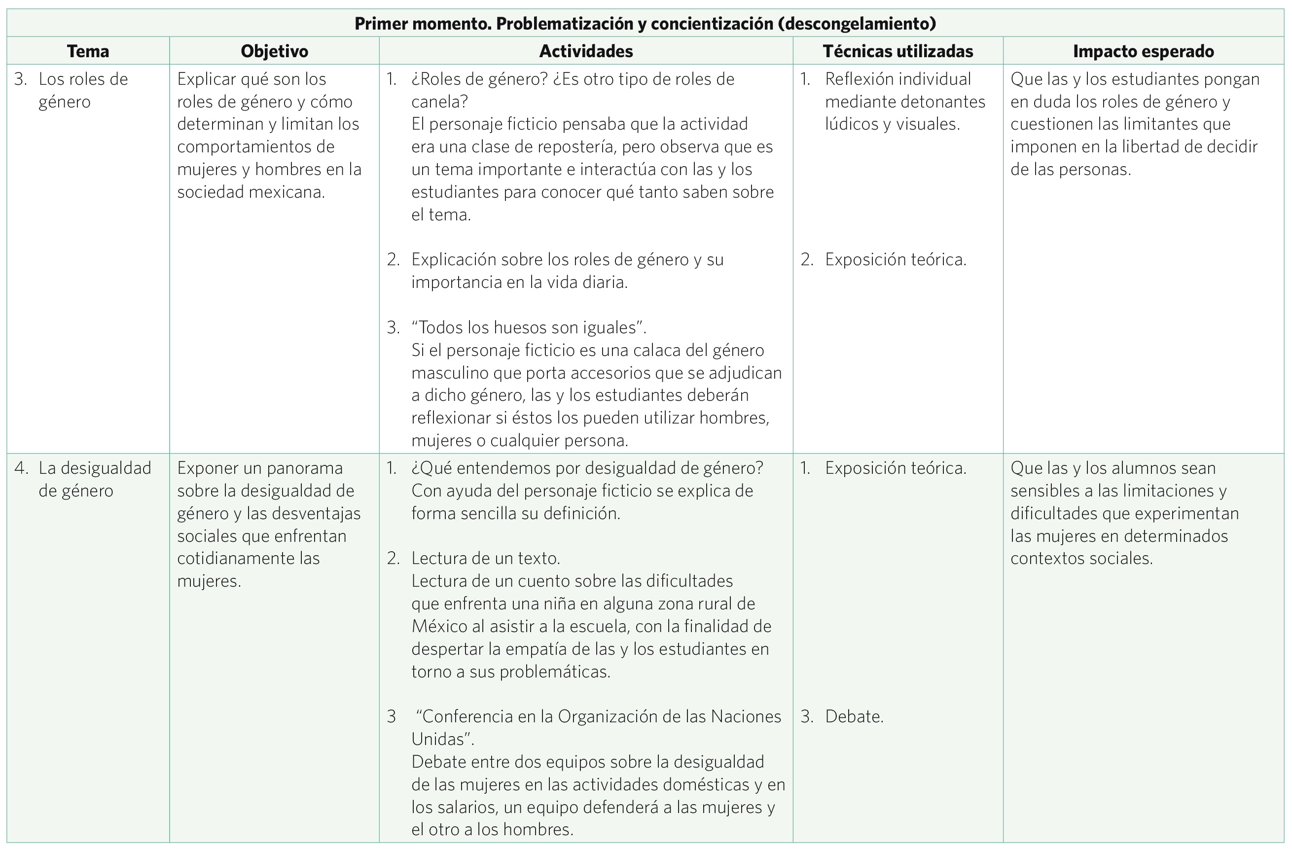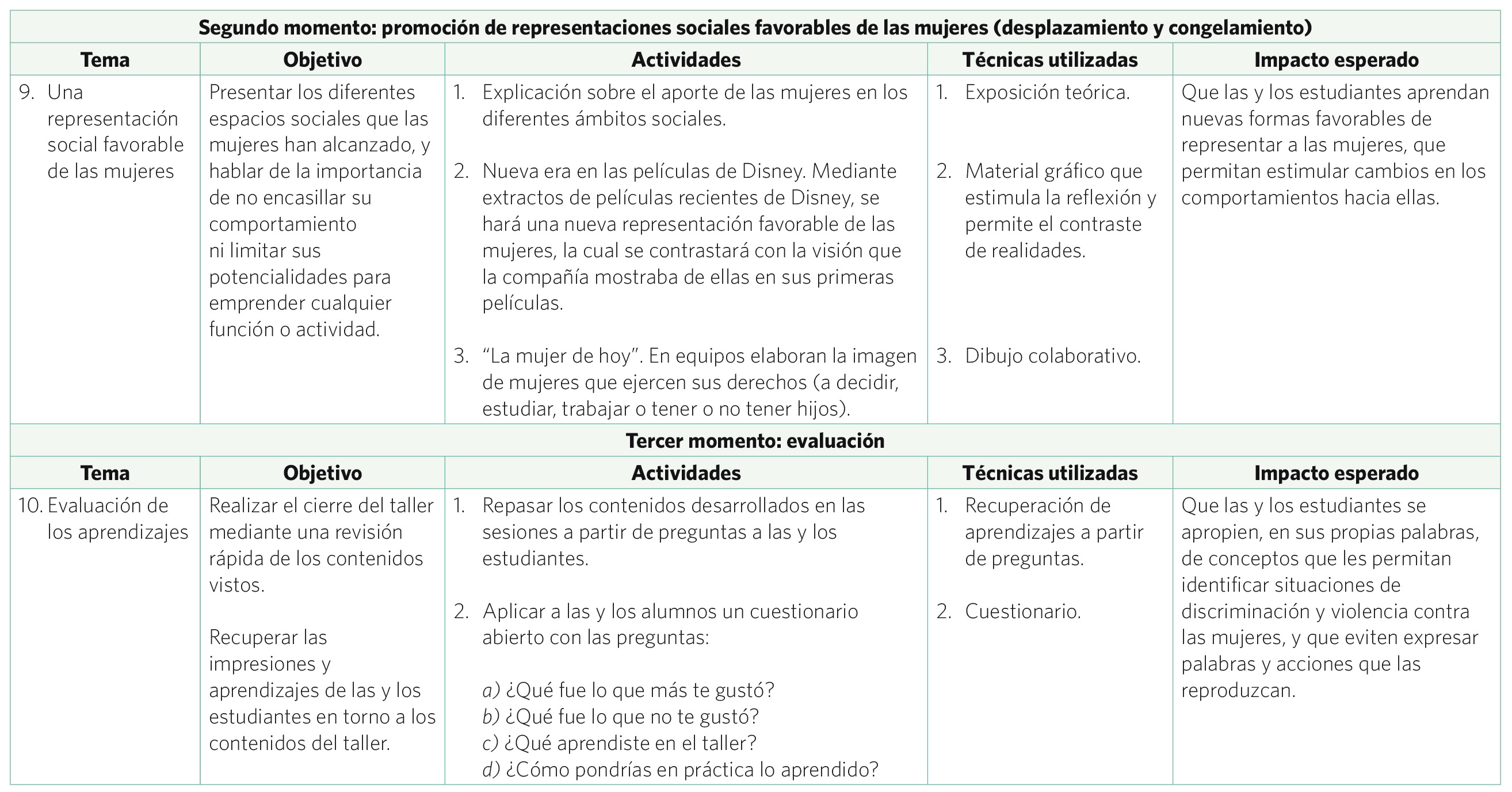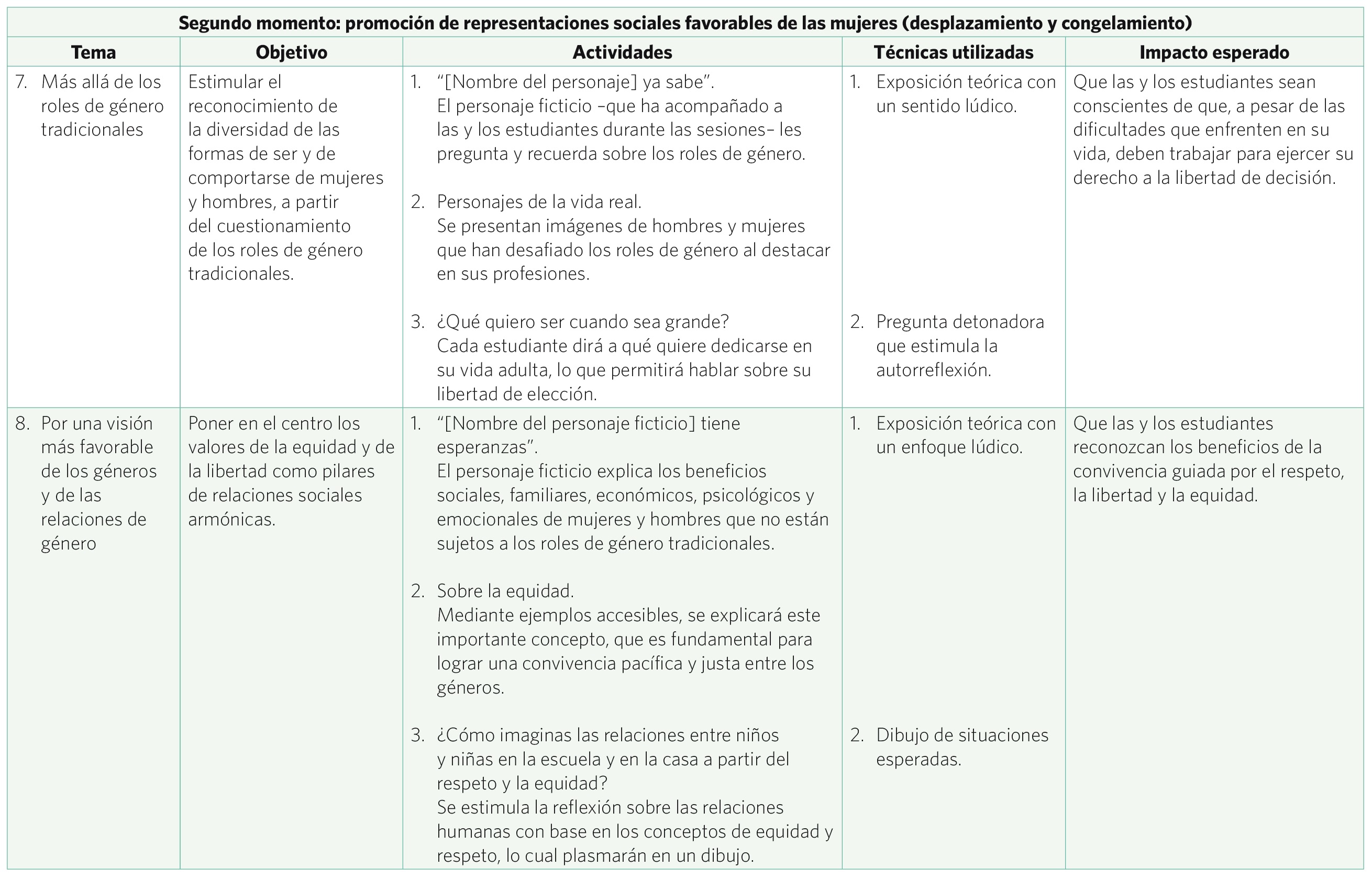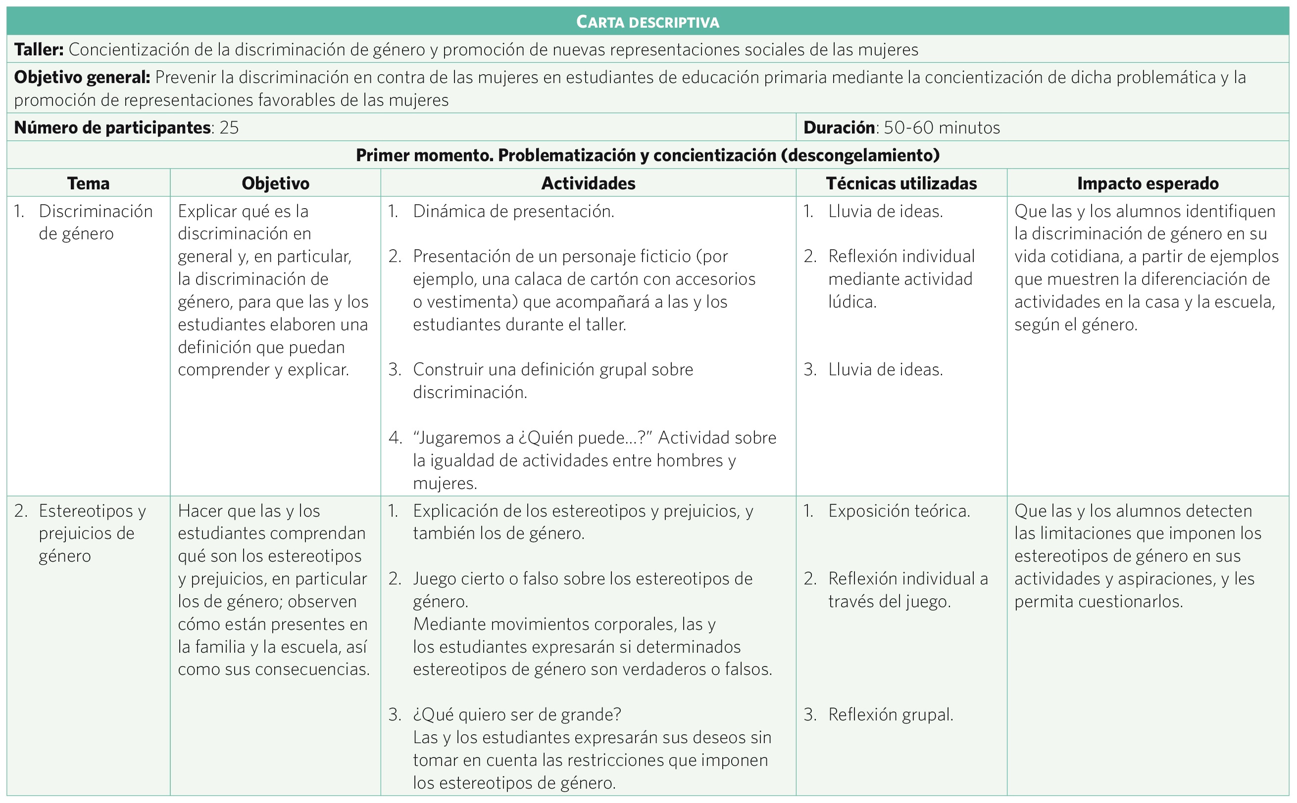 Ahora pasemos a las particularidades y contenidos del taller. Tanto la técnica de intervención propuesta como su orientación van encaminadas en la dirección de los planteamientos de Lewin. Por un lado, la naturaleza de la técnica del taller apunta hacia dinámicas grupales que estimulan importantes procesos como la participación, la concientización, la discusión y el trabajo colaborativo. Así, las características propias de un taller se aprecian como ventajas. Por otro lado, las temáticas del taller mantienen la misma secuencia que los pasos que conforman el modelo de cambio planificado, así como sus objetivos. Primero, se problematiza la realidad (paso del descongelamiento) que ha sido asumida como natural: la discriminación a las mujeres y la ideología machista que la sustenta, a través de creencias, discursos y prácticas, que se producen y reproducen en los contextos escolares a partir de las relaciones entre compañeras y compañeros y con el personal docente,56 y que hasta ese momento sus efectos negativos en la forma de mirar y de tratar a las mujeres habían sido ignorados. La problematización se encadena con la desnaturalización y la concientización. Mediante estos procesos se pretende restar el valor que la sociedad le ha adjudicado a dichas prácticas discriminatorias. Posteriormente, se introducen nuevas formas de pensar y de actuar libres de discriminación (pasos de desplazamiento y congelamiento), a partir de mostrar nuevas representaciones sociales sobre los roles y relaciones de género y de las mujeres. A continuación se presenta la carta descriptiva de la versión piloto del taller que se aplicó en estudiantes de segundo de primaria (7 a 8 años) de la institución privada.57