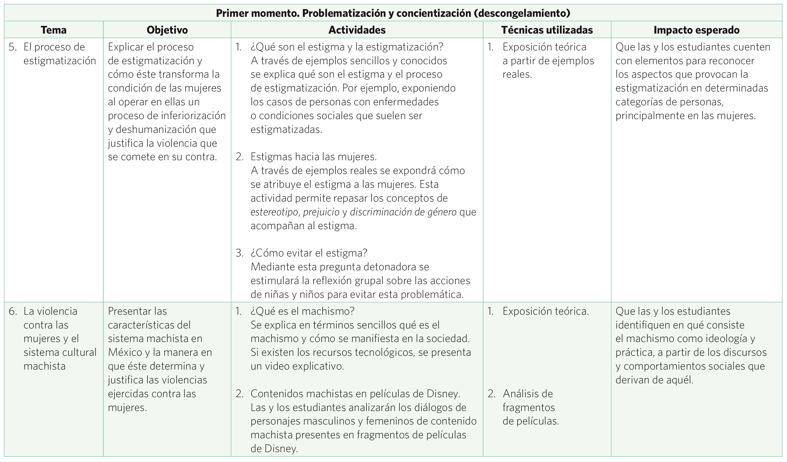 Las sesiones de la dos a las seis tienen el objetivo de concientizar sobre aquellas construcciones sociales que han contribuido a naturalizar y, por ende, a justificar la situación histórica de desigualdad contra las mujeres, como son los estereotipos, los prejuicios y los roles de género tradicionales, aspectos que también han promovido la ejecución de variadas violencias contra ellas, al cobijo de la ideología machista.