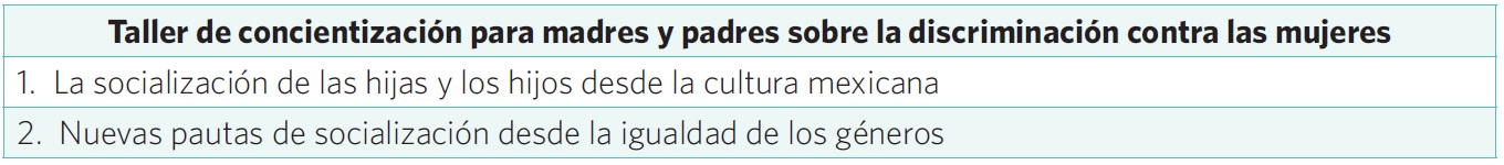Por último, una forma de asegurar los cambios consiste en dirigir los esfuerzos hacia la primera instancia socializadora: la educación en casa, pues de nada serviría estimular procesos de concientización en estudiantes en el contexto escolar, si dichos procesos no tienen eco en el hogar. Por esta razón, también se contempla la realización de un taller sobre discriminación de género con las madres y los padres de las y los estudiantes a quienes les fue impartido el taller, el cual considerará las siguientes temáticas: