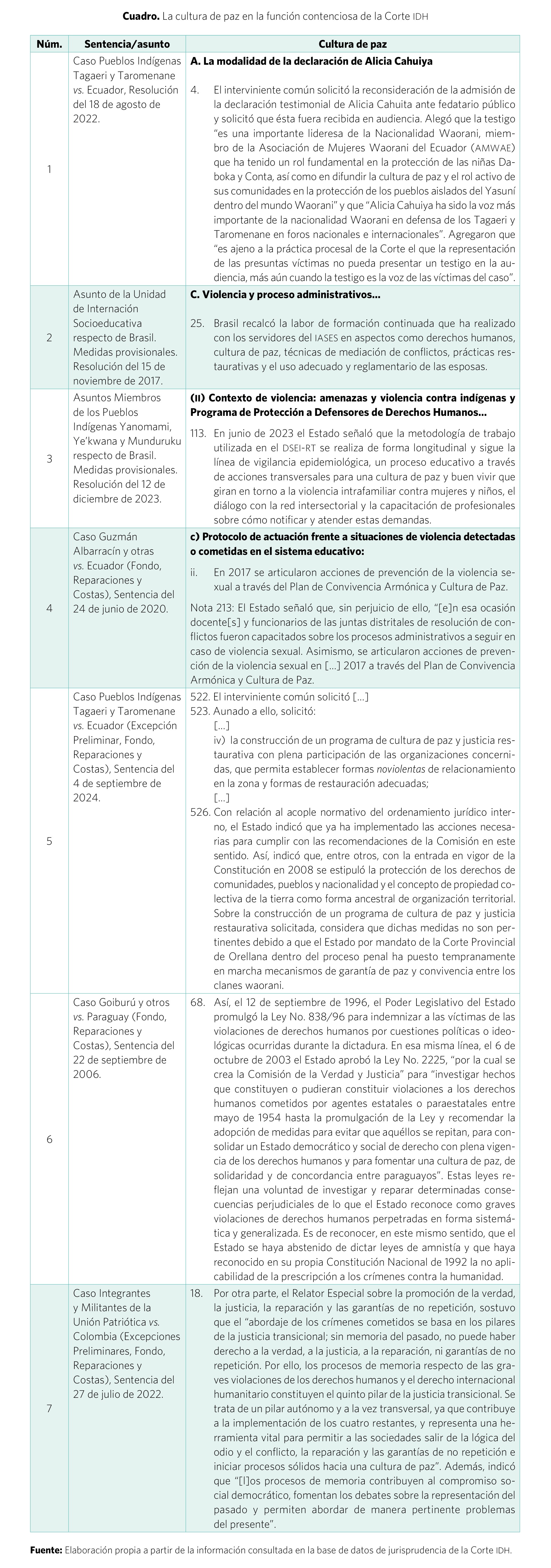 Al cierre de julio de 2025 se han registrado 553 sentencias en la sección contenciosa de la Corte IDH; y al realizar una búsqueda en su base de datos de jurisprudencia47 se localizaron únicamente los siguientes siete casos contenciosos (dos de los cuales están relacionados con medidas provisionales) donde se menciona la expresión cultura de paz: